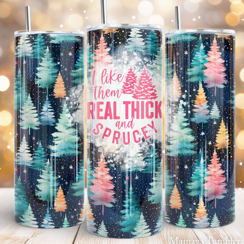 Introducing the Thick and Sprucey Tumbler - the perfect addition to your holiday drinkware collection. With a thick and sprucey design, this tumbler adds a touch of humor to your Christmas celebrations. Made with high-quality materials, it is durable and perfect for keeping your drinks hot or cold. Enjoy your favorite beverages in festive style!